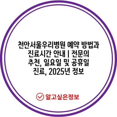 천안서울우리병원 예약 방법과 진료시간 공지 | 전연락 추천, 일요일 및 공휴일 진료, 2025년 정보